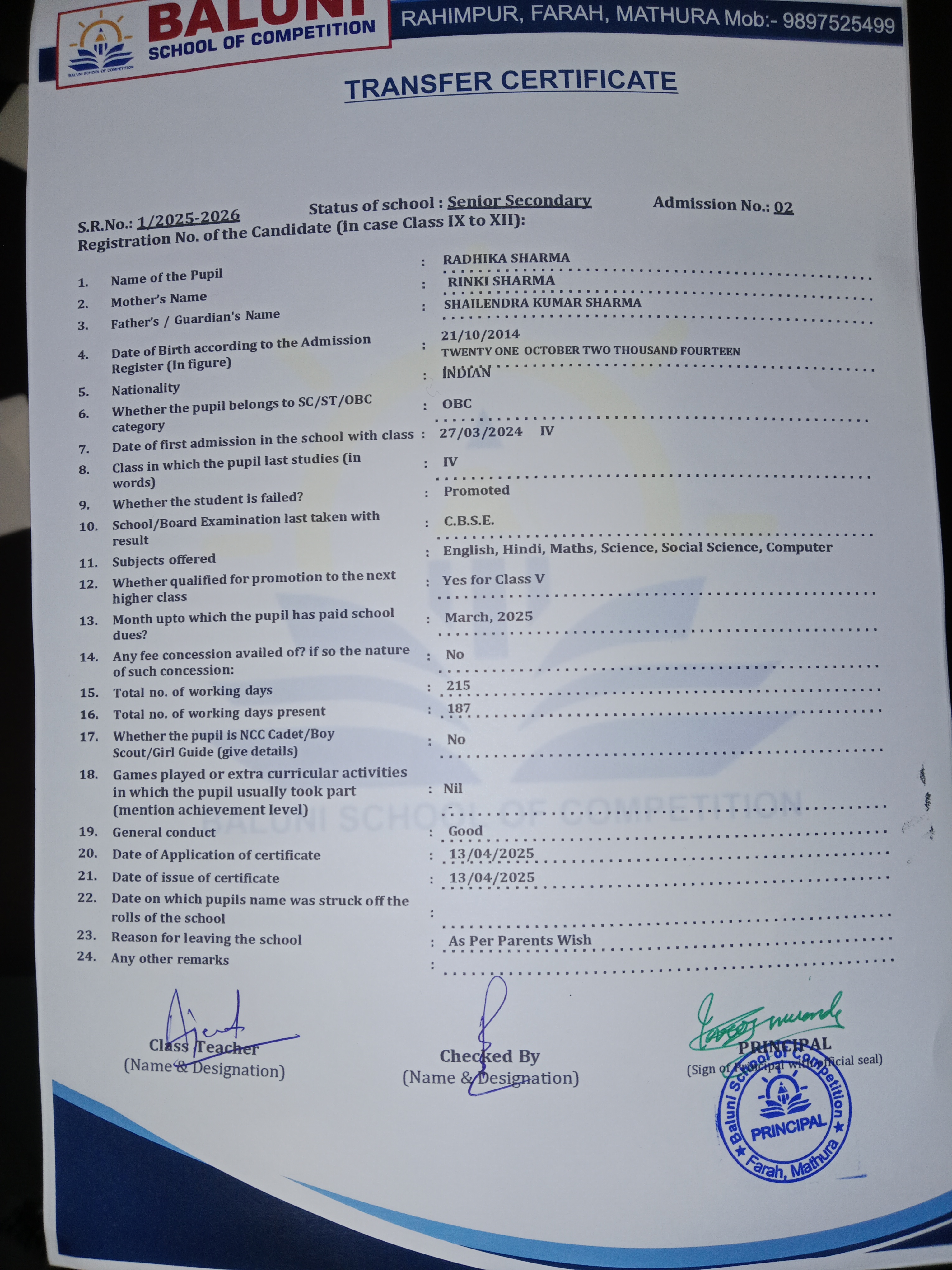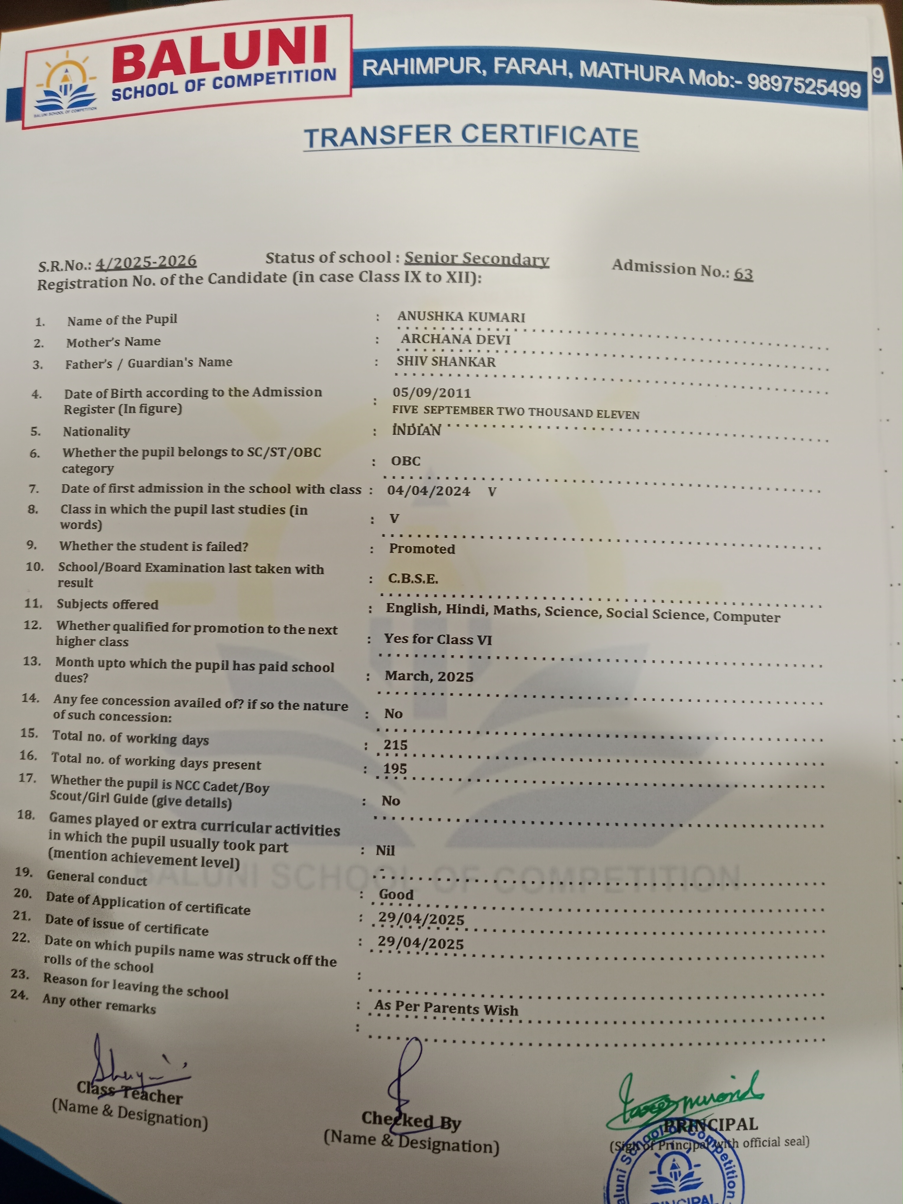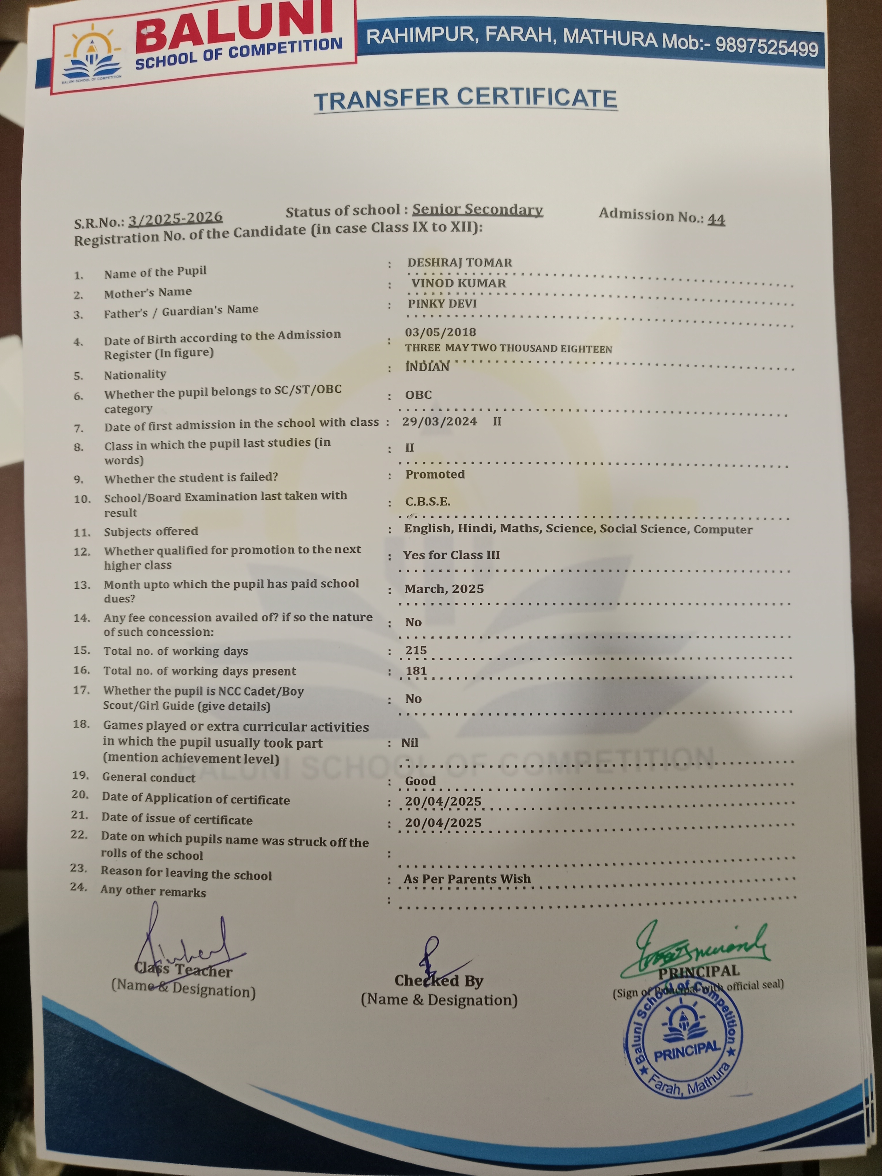 Transfer Certificate
