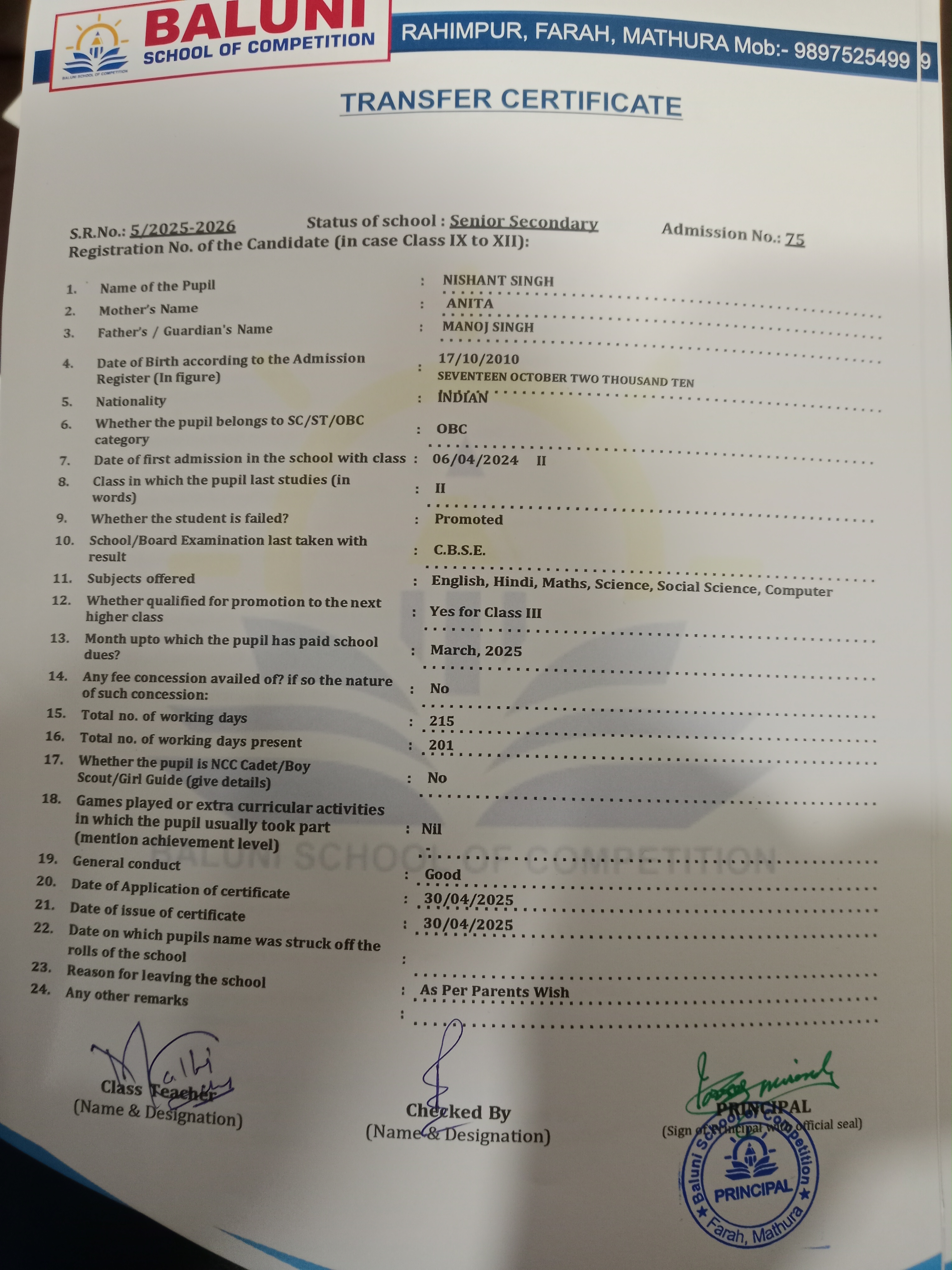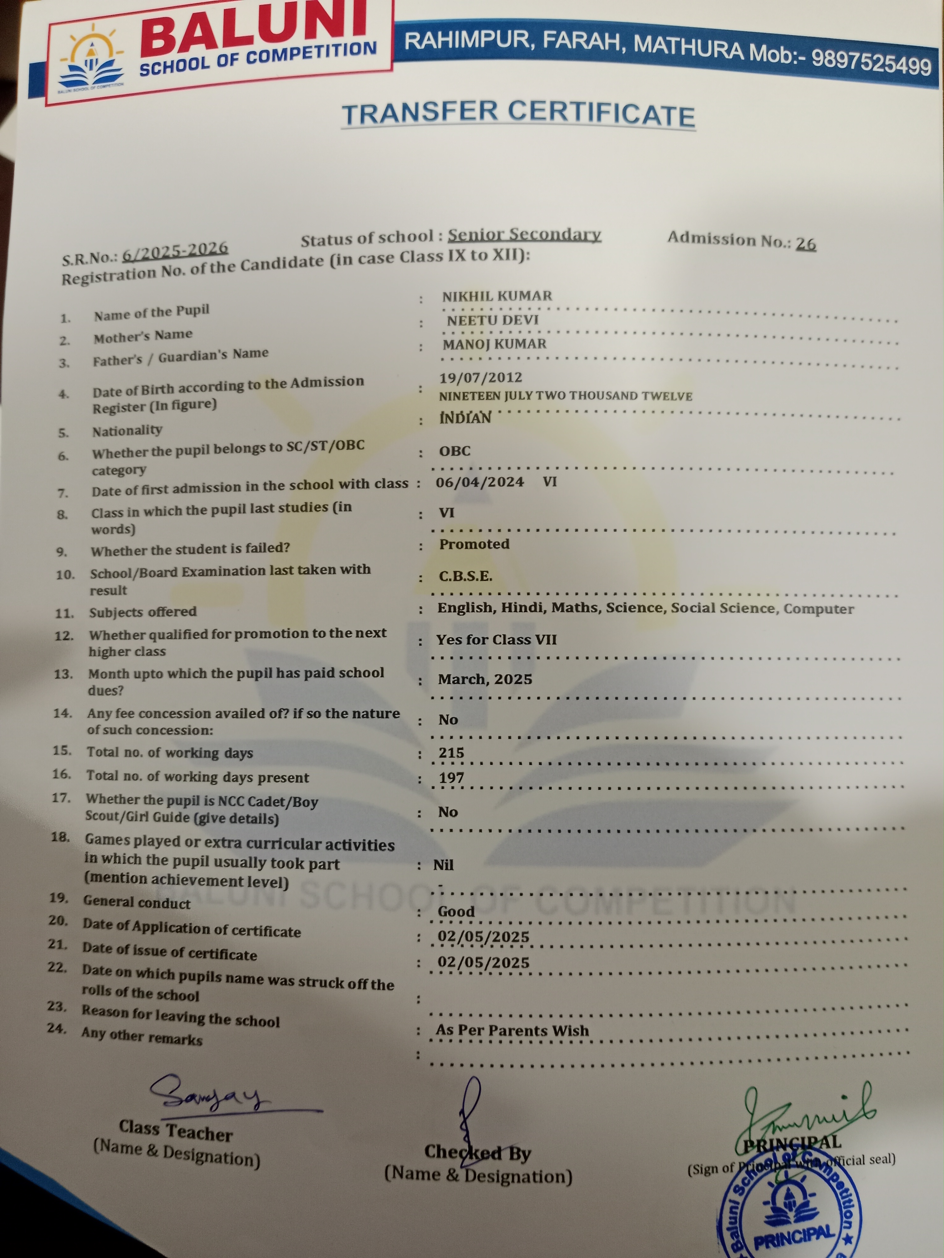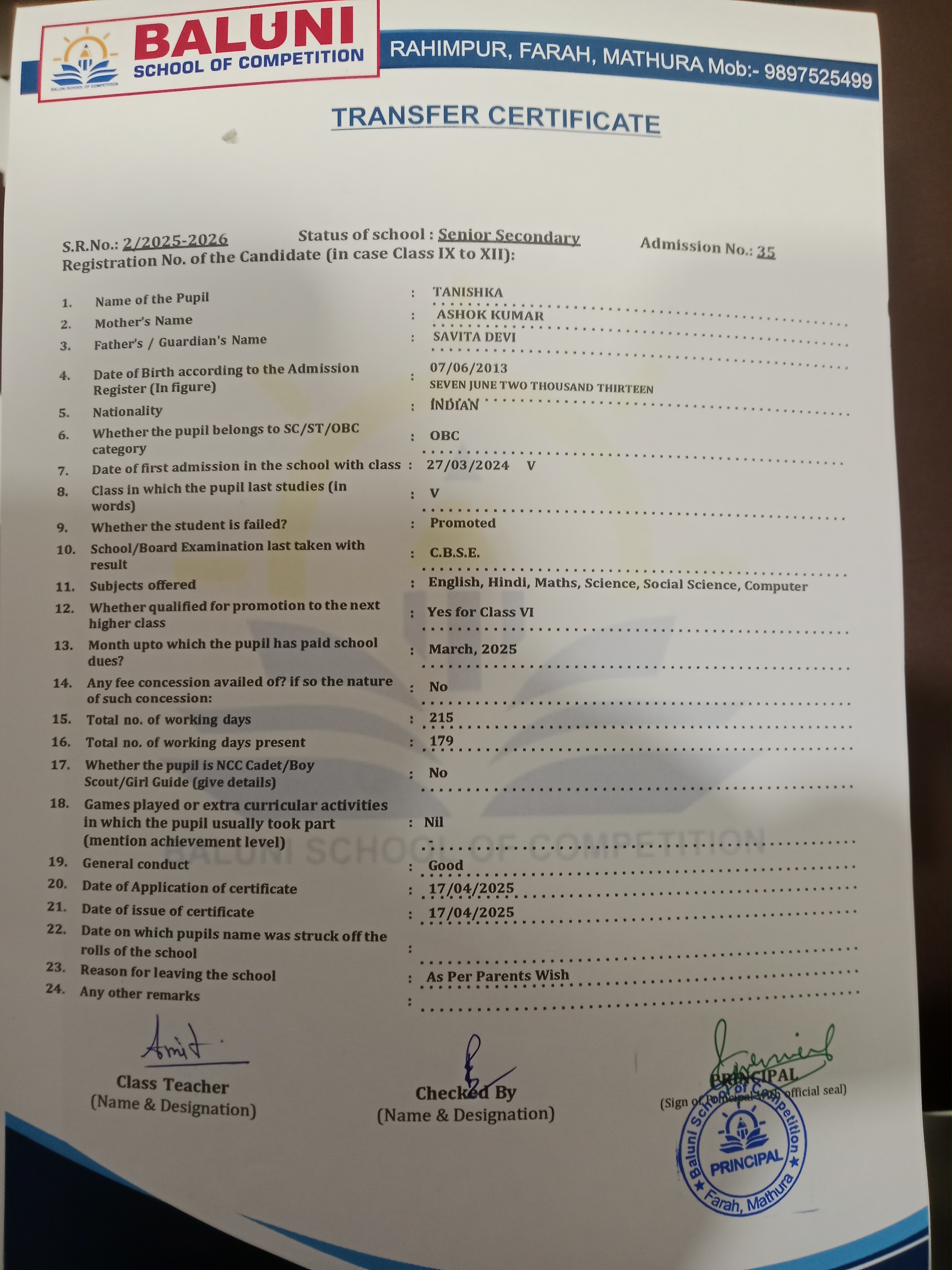 Transfer Certificate